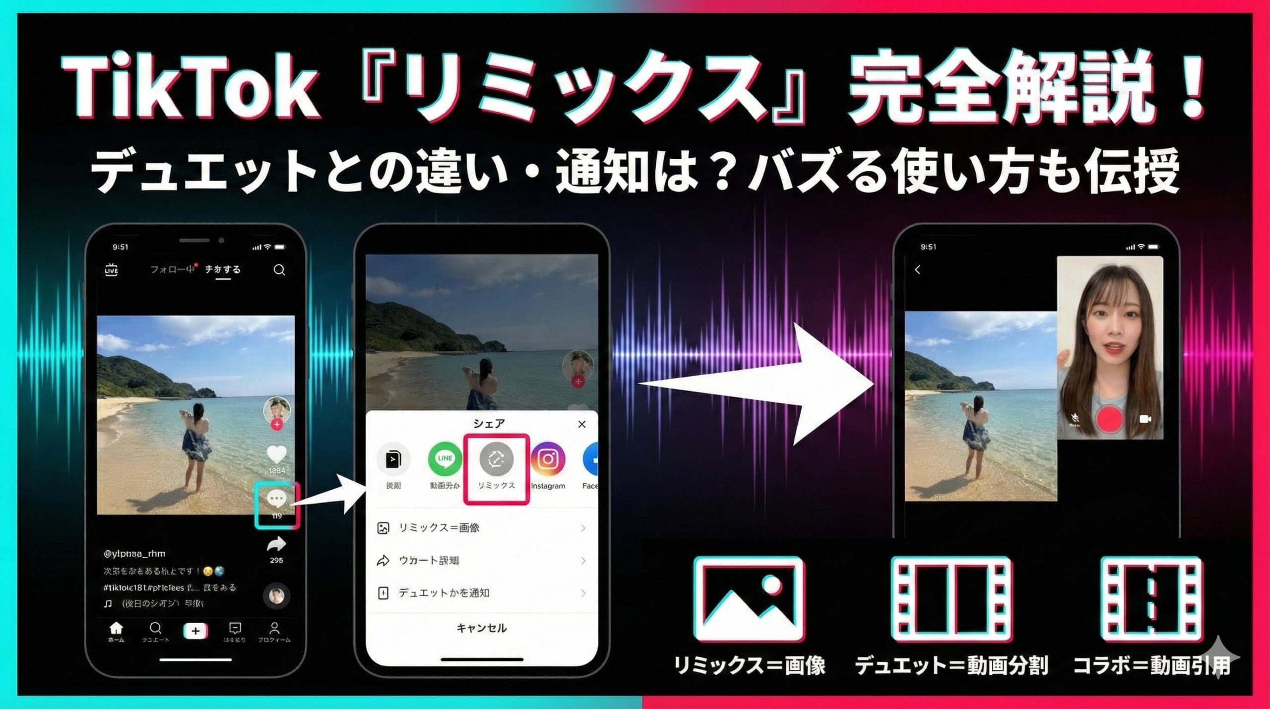 この記事では、TikTokの「リミックス」機能の正体と、デュエットとの決定的な違い、そして実際にリミックスを使って再生数を伸ばす方法を初心者向けに分かりやすく解説します。