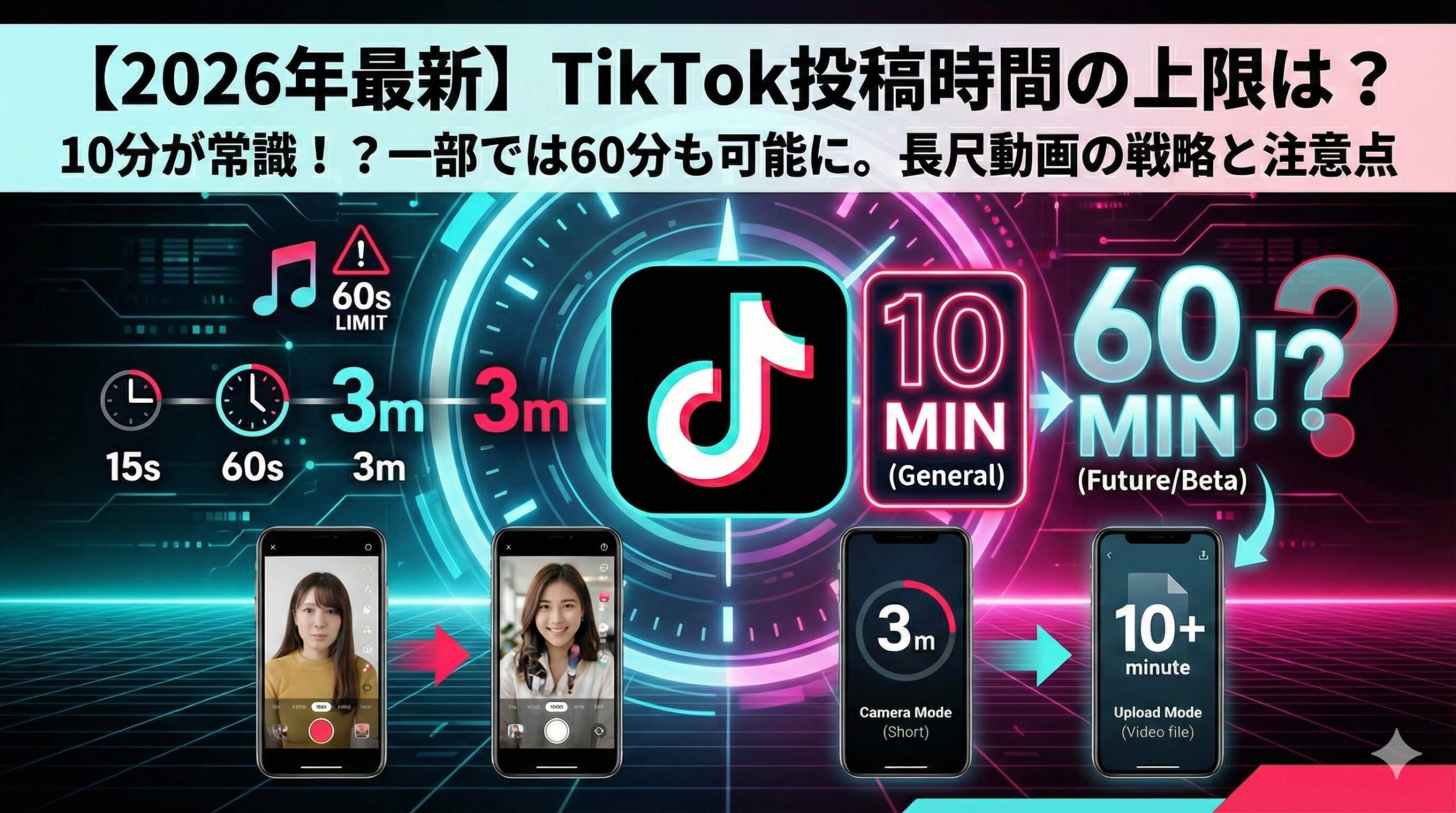 ただし、TikTokは現在YouTubeに対抗するために長尺動画を強化しており、一部のクリエイターやテスト環境では「30分」や「60分」のアップロードが可能になっています。